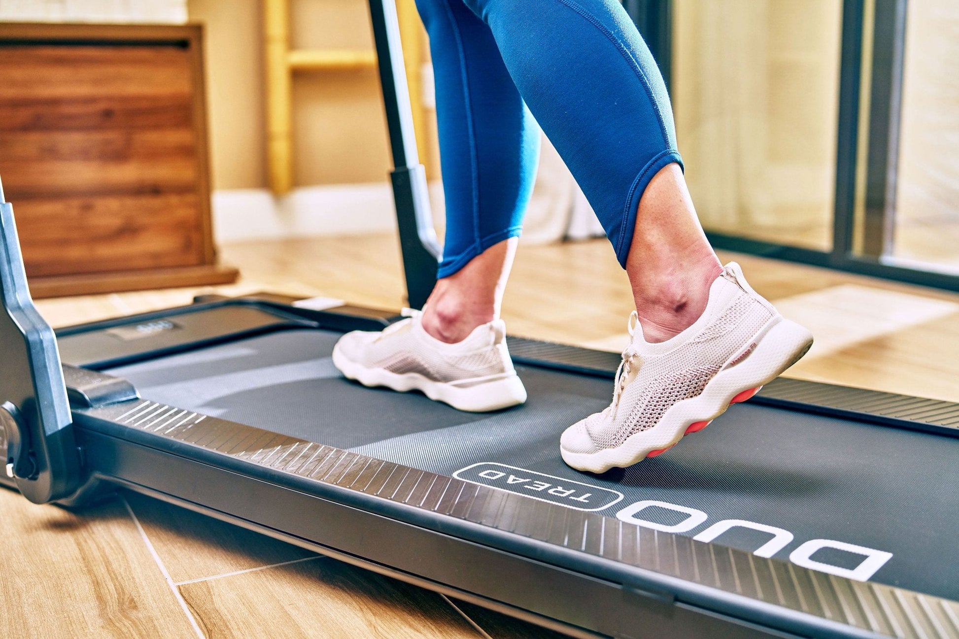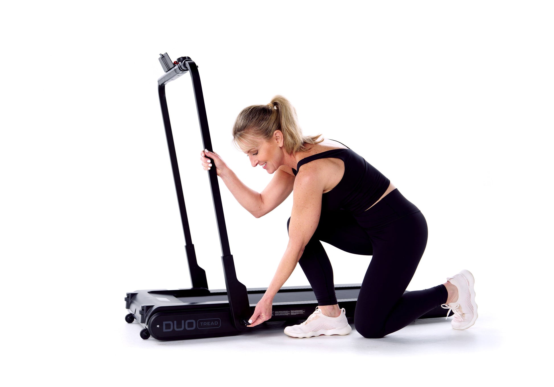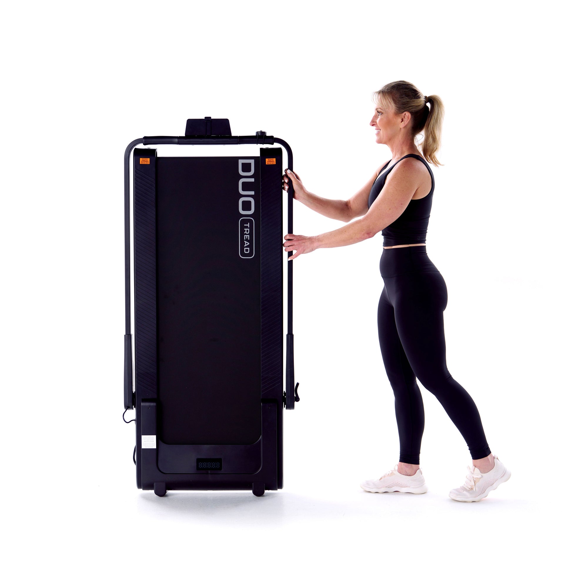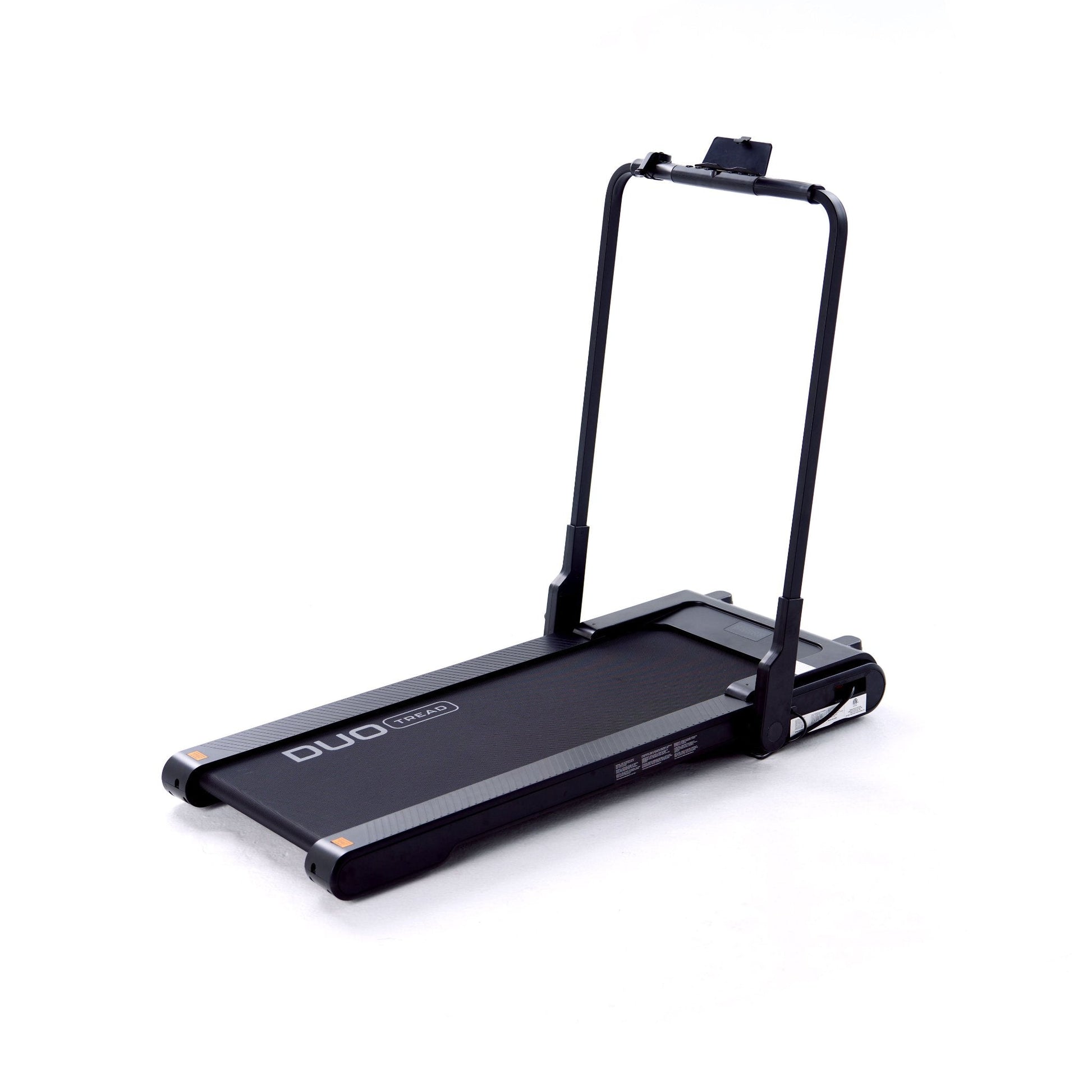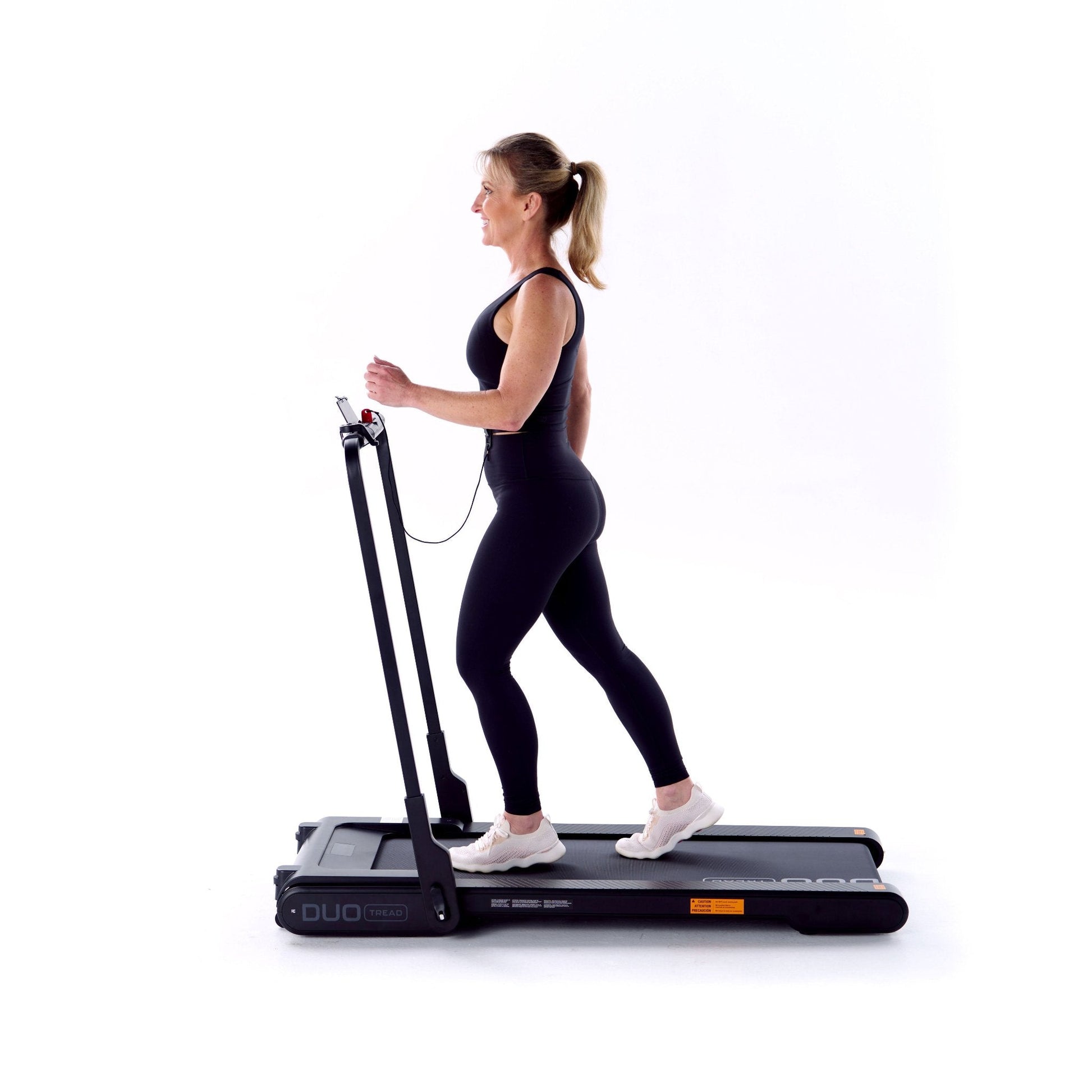 | Achieve your fitness goals with ease by bringing the DuoTread multi-speed treadmill into your home. Designed for both walking and running, it features manual incline adjustments up to 4.1%. Easy storage standing under 5” high with a wheeled base to keep your space clutter-free. The treadmill includes a detachable remote control and a folding support bar that provides stability while running or walking as needed. In walking mode, the speed can be controlled from 0.6 MPH to 3.7 MPH. In running mode, the speed ranges from 0.6 MPH to 7.5 MPH. For added convenience, the treadmill features a media tray and device holder. Don’t let space be an issue any longer with this sleek and compact treadmill. Please note, this treadmill does NOT connect to the Echelon Fit® App. | Regular price