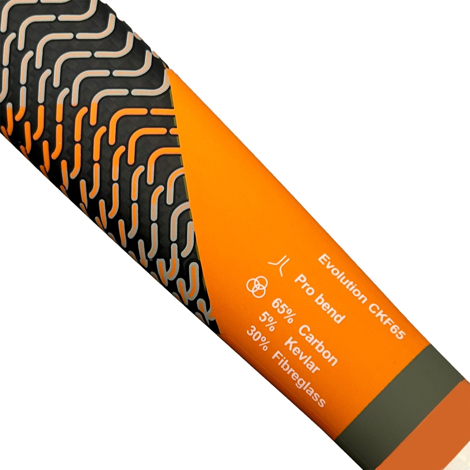 The Evolution CKF65 is a 65% carbon lay-up model with the high-quality Toray carbon placed in multi-direction laminate sheets (creates strength in all directions) across a (25%) fiberglass skeleton and with integrated fiberglass laminates giving great touch and feel with the (10%) Kevlar increasing durability, stiffness and laminate bonding. This model is available in the less aggressive Pro (low) bend (24mm @ 230mm).  Dual-process vibration control (Piezo-Electric fibers, M-Gel)