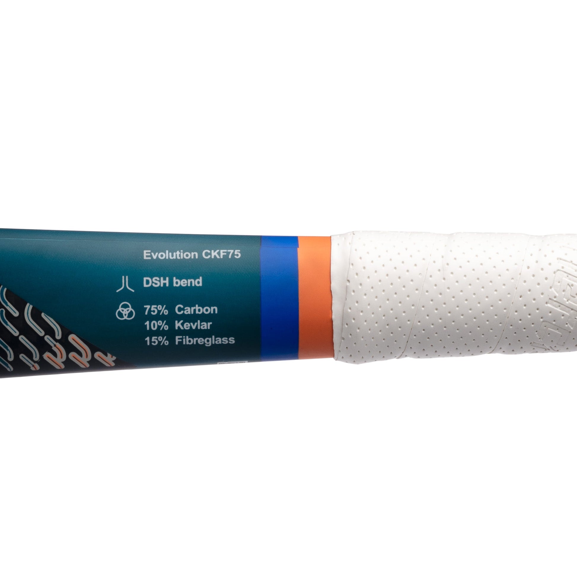 The Evolution CKF75 is a 75% carbon lay-up model with the high-quality Toray carbon placed across a (15%) fiberglass skeleton giving good touch and feel with the (10%) Kevlar increasing durability, stiffness and laminate bonding. This model is available in the DSH bend with a scooped face (23mm @ 270mm)