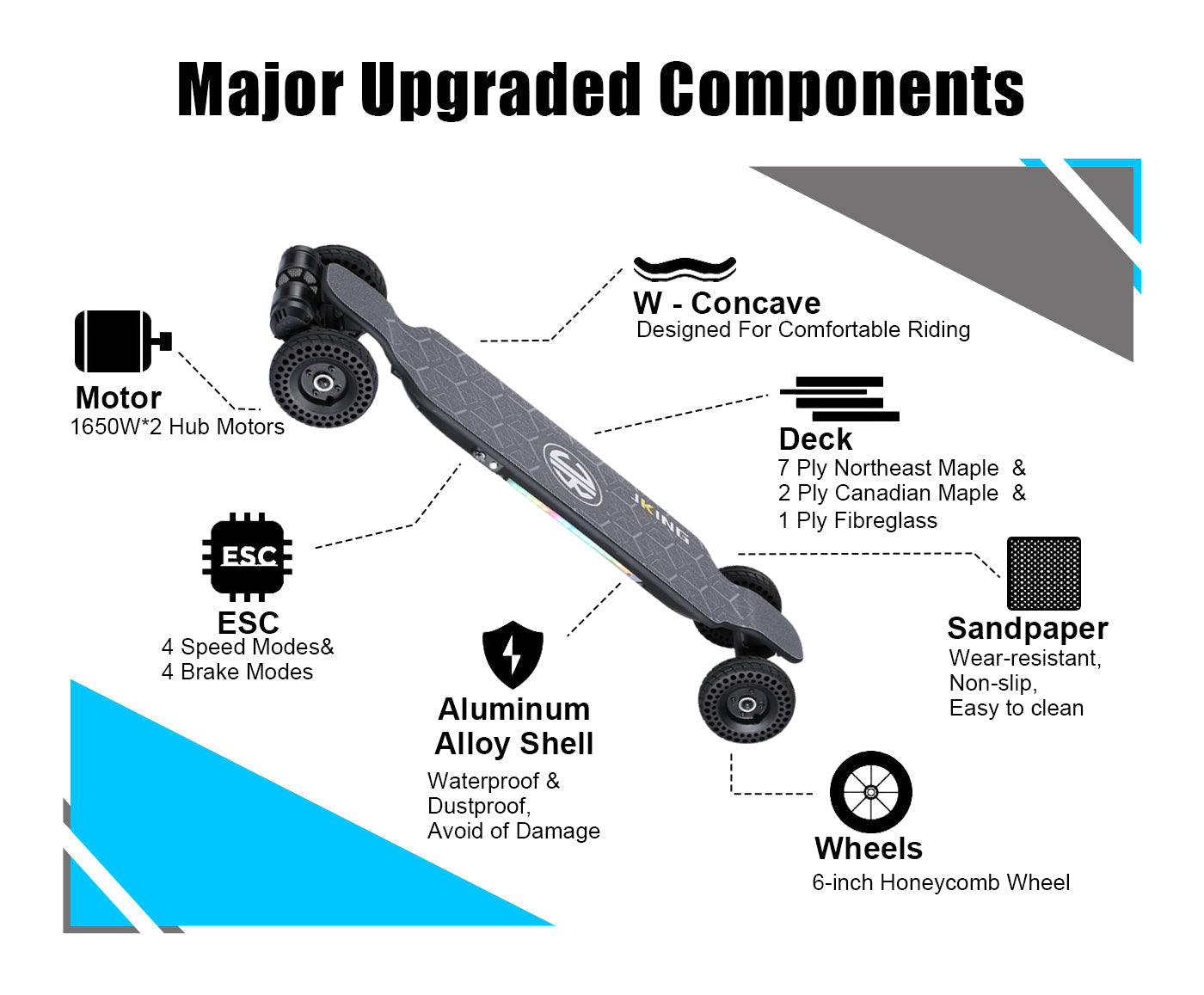 1650W DUAL BRUSHLESS OUTER ROTOR MOTOR - 1:5 reduction ratio, more strong powerful than hub motor.JKing Wireless Remote E-Skateboard This motor supports max 22°climbing angle.