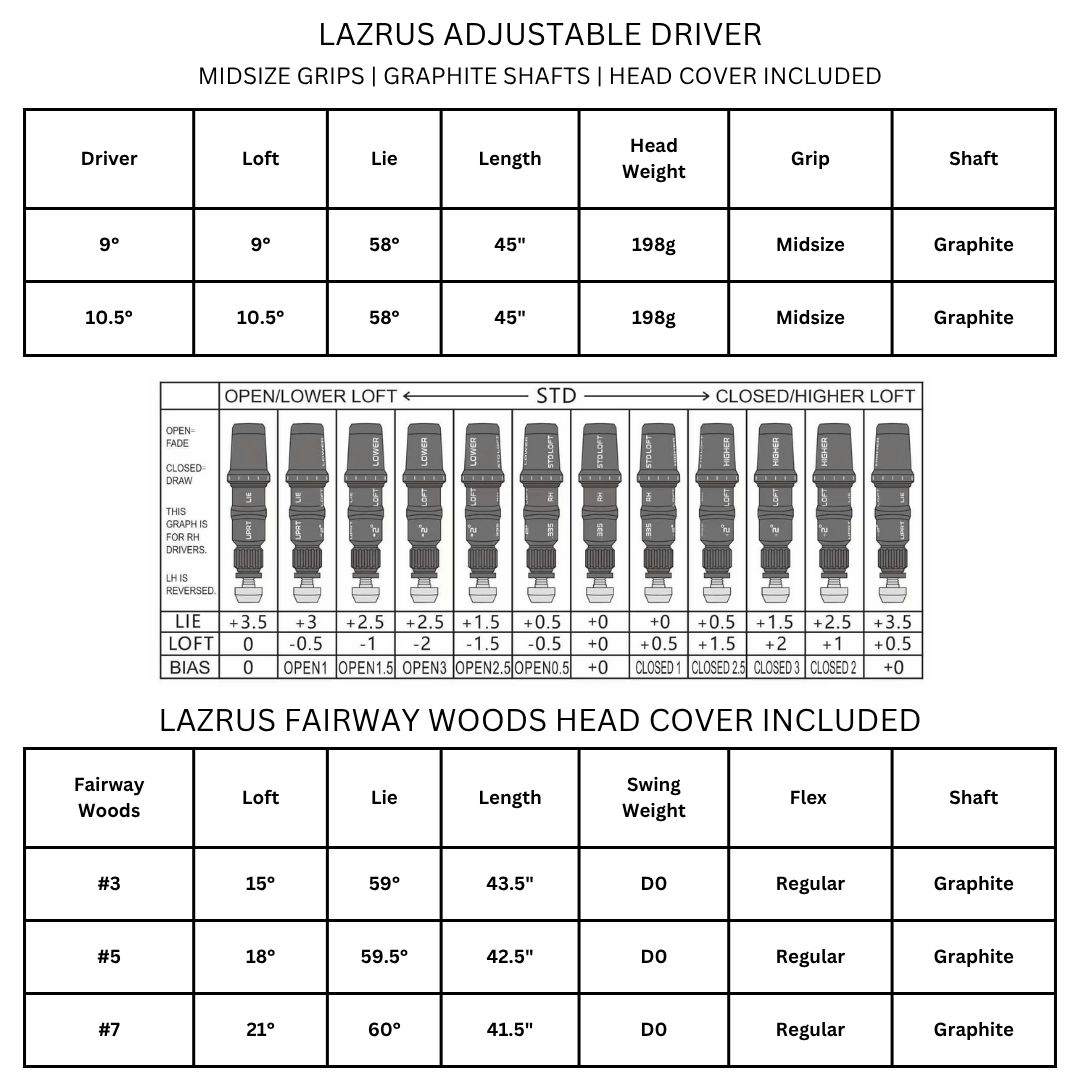 Elevate your golf game with the Lazrus Golf LAZ2 Adjustable Driver and Fairway Wood Bundle, a dynamic duo that offers unmatched value for the everyday golfer. These clubs deliver pro-level performance at a fraction of the cost.